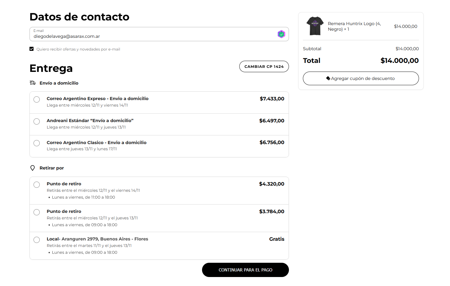 - Seleccioná el medio de envío que querés y hacé clic en ""Continuar""